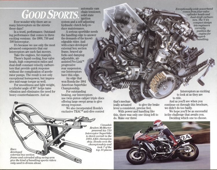 The first production motorcycle in the 1000cc VF range known as the 1000 Interceptor, was launched in the USA and Canada in March 1984.